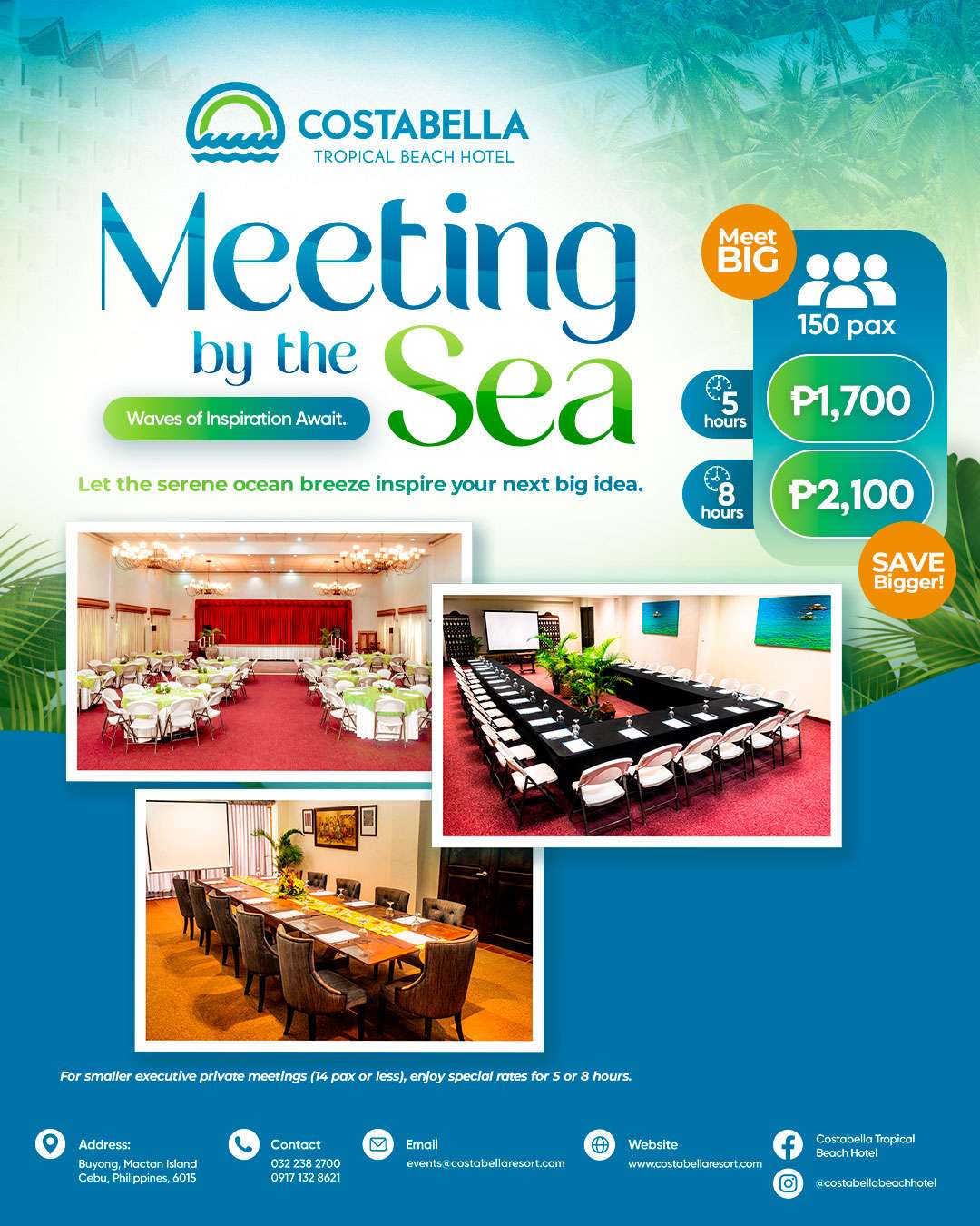 Make your meetings and events special at Costabella. With a beautiful beachfront, comfortable venues, and friendly service, we help you create smooth and memorable gatherings — whether it’s for work or celebration.