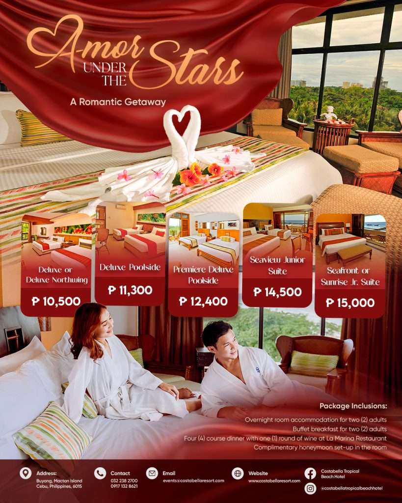 Premium: Php 10,000 per couple – includes a bottle of wine & use of the Lover’s Cabana and a well-arranged bouquet.
