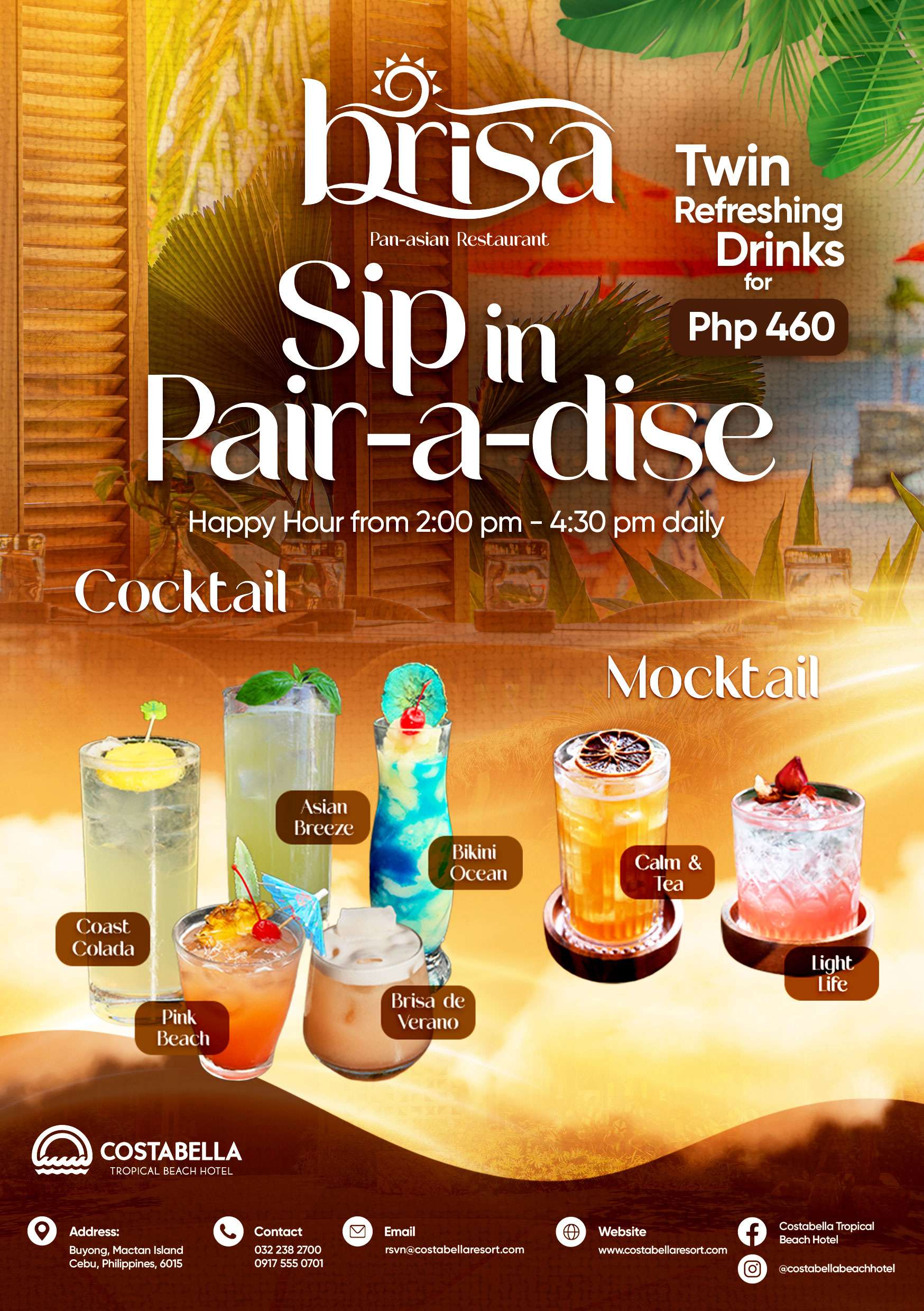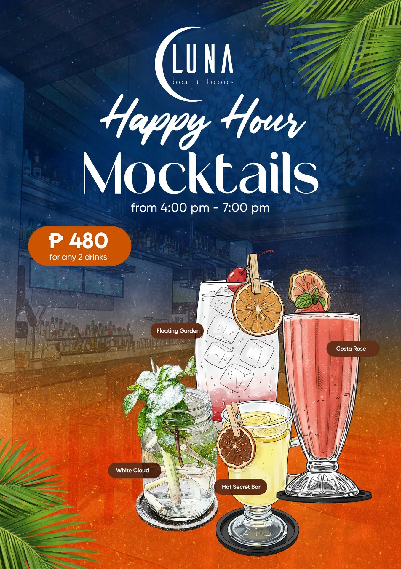 Enjoy any 2 drinks for just ₱480 – mix and match cocktails and mocktails to create your perfect pairing.