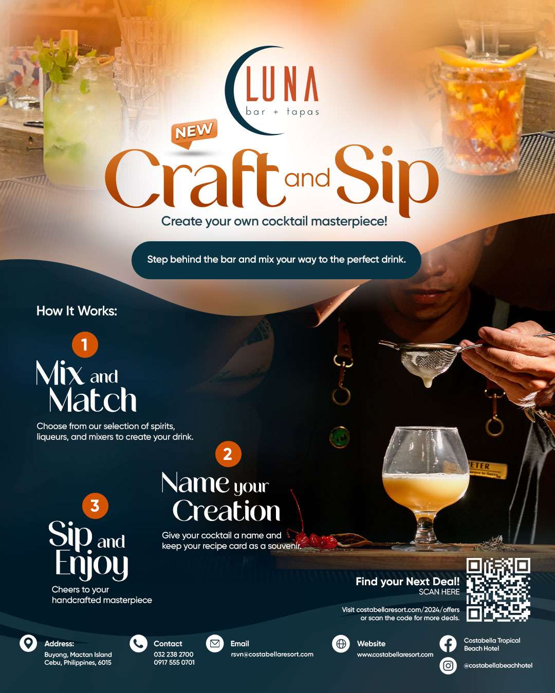 Ever dreamt of stepping behind the bar? Now’s your chance! At Luna Bar + Tapas at Costabella Tropical Beach Hotel, we invite you to take the reins and Create Your Own Cocktail Masterpiece with our new Craft & Sip experience.
