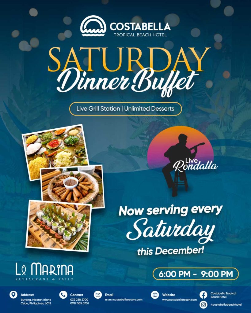 Indulge in a hearty dinner buffet at La Marina featuring a Live Grill Station, unlimited desserts, and the timeless charm of Live Rondalla music.
